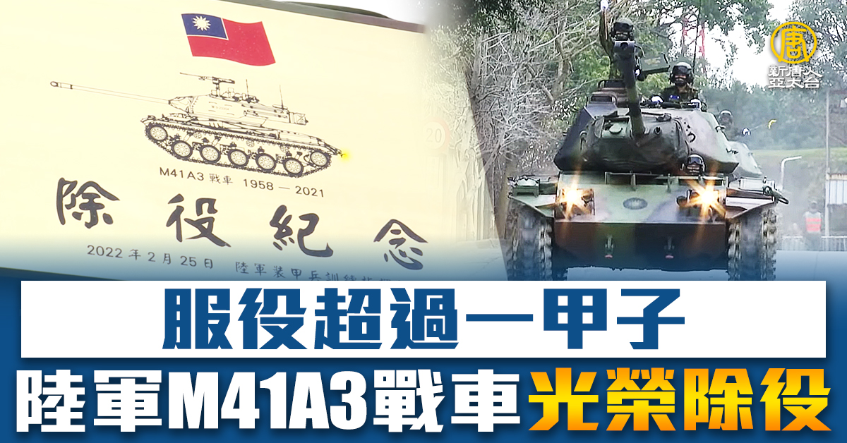 【新唐人亞太台 2022 年 02 月 25 日訊】陸軍裝甲兵訓練指揮部今(25)日上午,在新竹湖口長安營區,舉辦「陸軍M41A3戰車除役典禮暨裝訓部93周年隊慶」,由陸軍司令徐衍璞上將主持,也邀請歷任指揮官及貴賓共襄盛舉。典禮儀式,戰車繞行會場,做最後的巡禮,光榮除役。