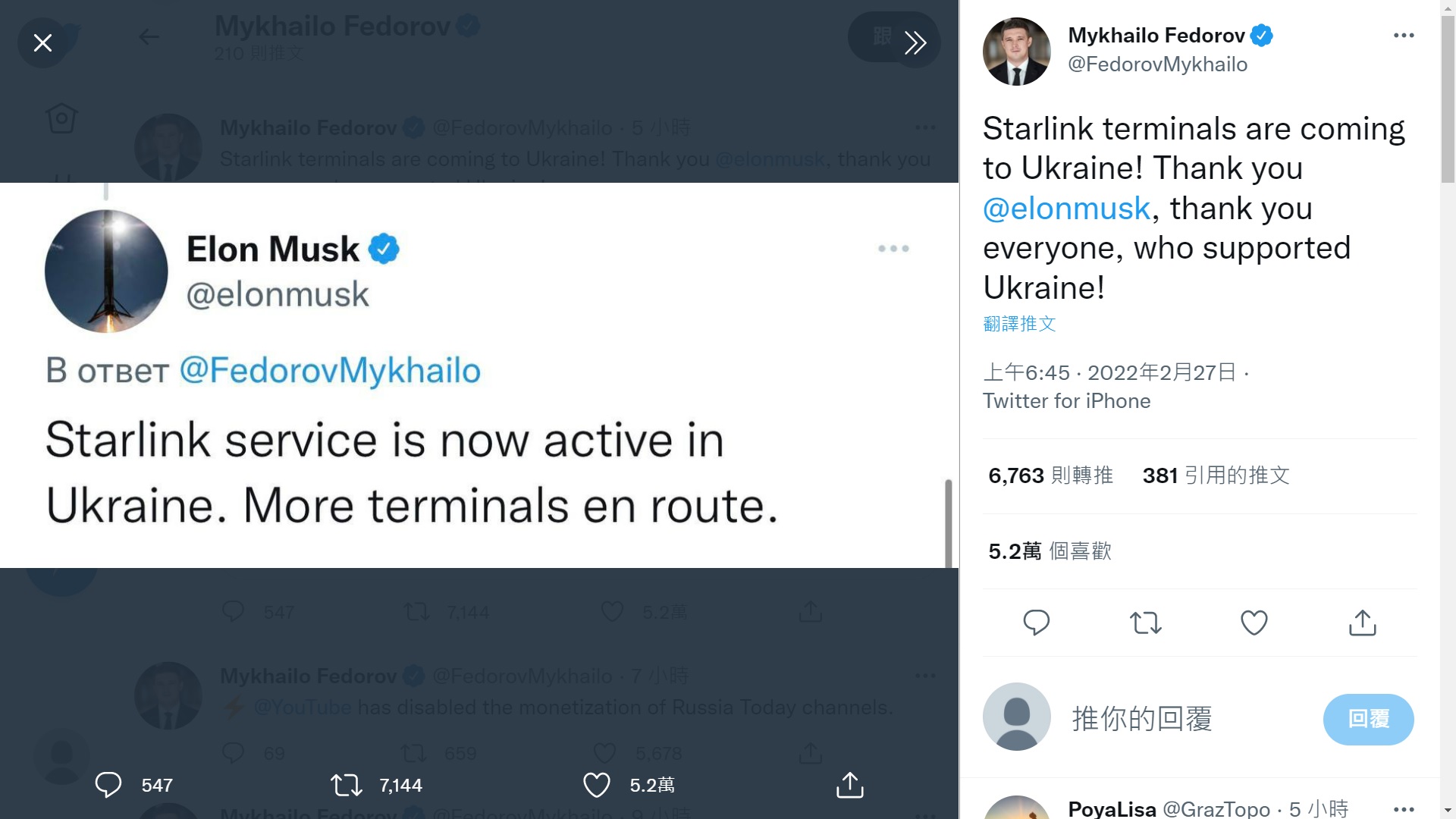 烏克蘭副總理費多羅夫(Mykhailo Fedorov)先前推文公開向馬斯克(Elon Musk)喊話:「當你試圖殖民火星時,俄羅斯正試圖占領烏克蘭!當你的火箭成功從太空著陸時,俄羅斯的火箭正在襲擊烏克蘭平民百姓!」推文還標註馬斯克的帳號。