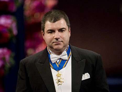 2010 年 12 月 10 日,在斯德哥爾摩音樂廳舉行的諾貝爾獎頒獎典禮上,俄羅斯裔英國教授康斯坦丁·諾伏西羅夫 (Konstantin Novoselov) 在接受瑞典國王卡爾十六世·古斯塔夫 (Carl XVI Gustaf) 頒發的諾貝爾物理學獎後旁觀。 (Photo credit should read JONATHAN NACKSTRAND/AFP via Getty Images)