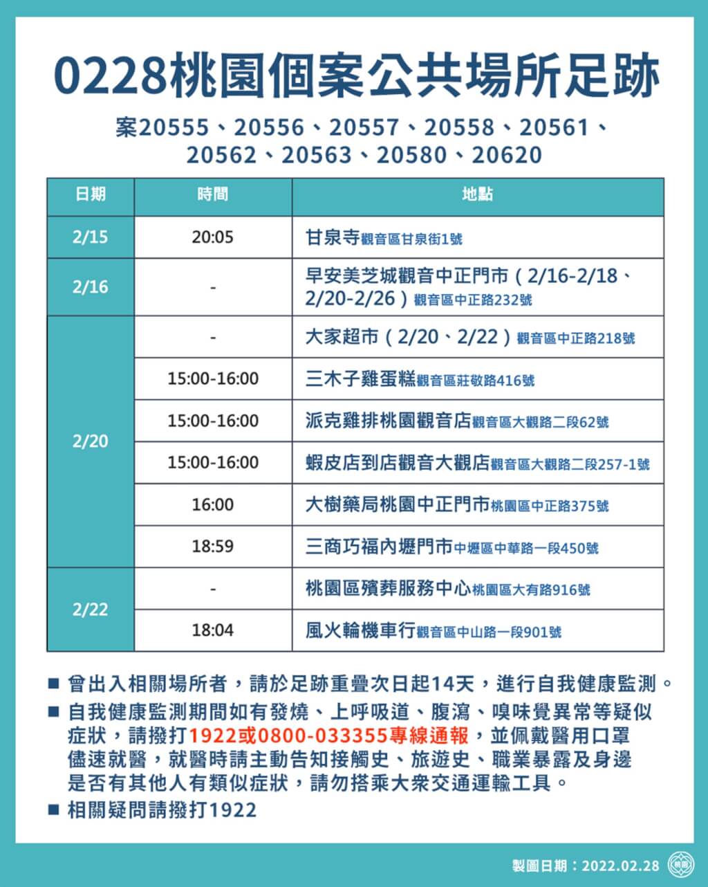 新聞處長詹賀舜表示,相關個案15日晚間曾至觀音區甘泉寺;16日至18日及20日到26日,去過早安美芝城觀音中正門市;20日及22日曾到大家超市、20日下午去過三木子雞蛋糕、派克雞排桃園觀音店、蝦皮店到店觀音大觀店、大樹藥局桃園中正門市、三商巧福內壢門市;22日曾到桃園區殯葬服務中心,並在同日晚間到觀音區風火輪機車行。