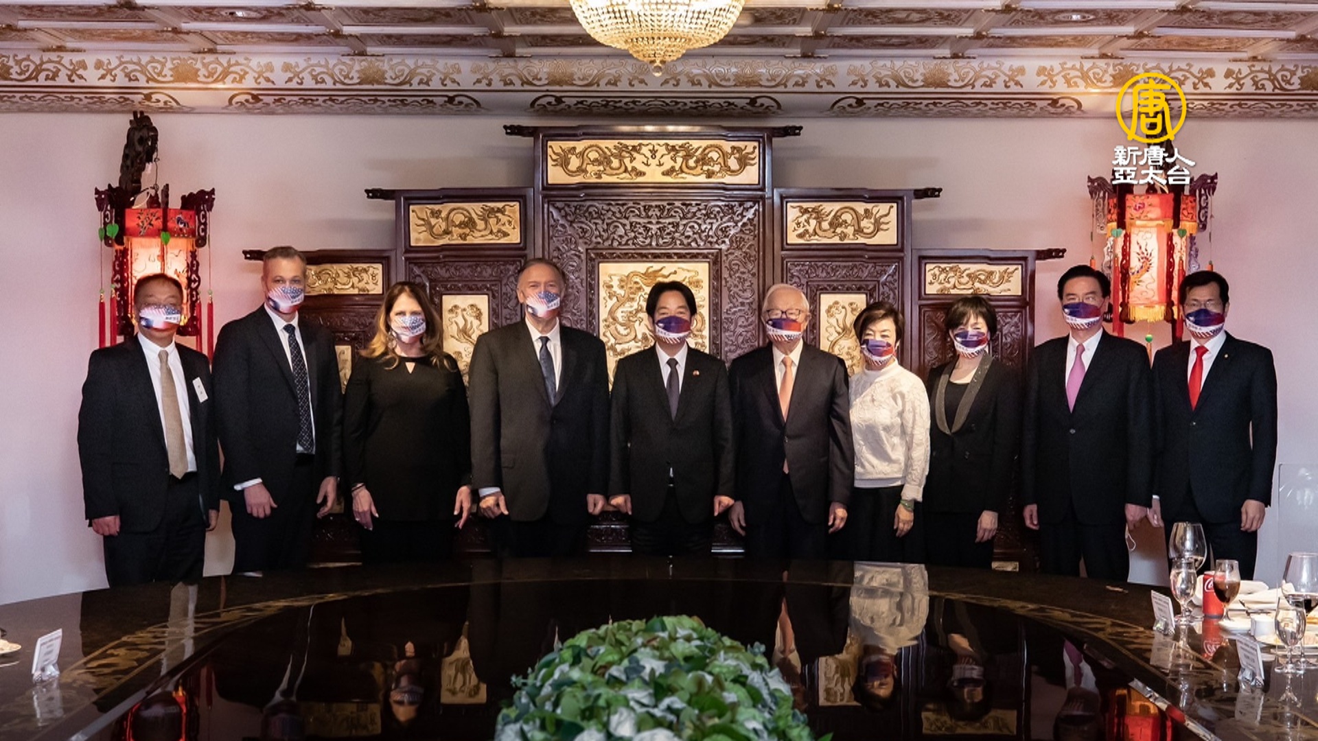 【新唐人亞太台 2022 年 03 月 04 日訊】美國前國務卿蓬佩奧昨晚參加副總統賴清德在圓山飯店作東的晚宴,相談甚歡2個小時,包括台積電創辦人張忠謀伉儷、欣陸控股公司董事長殷琪都是座上賓,賴清德在臉書上表示,他特別準備蓬佩奧思念的台灣鳳梨乾和佳餚迎賓,賴清德指出,西點軍校出身的蓬佩奧,過去曾大力推動台美兩國在國防安全、民主人權、經貿、科技及教育等領域的合作,不只撤銷台美來往限制,也對強化台灣安全、建立雙邊機制提供實質幫助。賴清德說,台美都共享民主自由對人權的普世價值,與會的民進黨立委羅致政表示,氣氛非常好,話題很廣,從選舉、兩岸局勢到烏克蘭局勢。大合照時,所有人都戴上台美友好口罩,上面寫著「堅若磐石」。