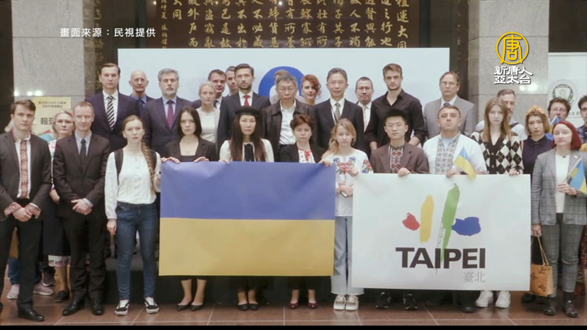 拉起烏克蘭國旗,柯文哲和歐盟代表,週四聚集在北市府1樓中庭,站出來聲援,還特別設置了加油牆。