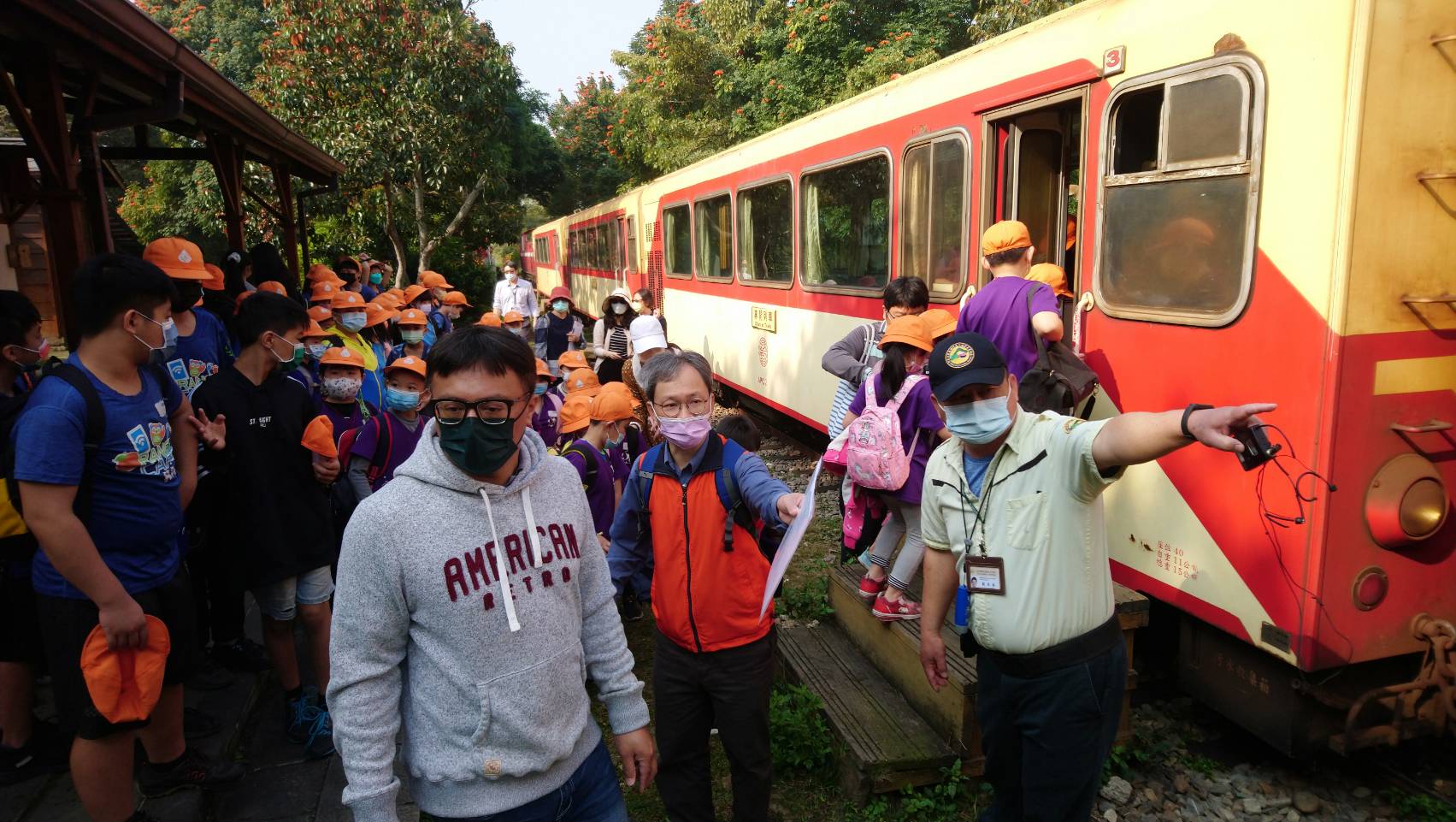 竹崎高中阿里山青年大使,今天(4日)上午帶領圓崇國小全校師生,進行竹崎車站踏查導覽。(竹崎高中提供)