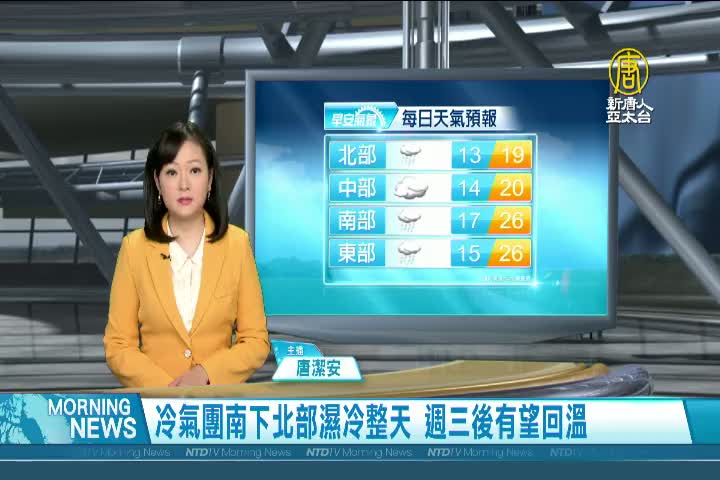 【新唐人亞太台 2022 年 03 月 07 日訊】歡迎您收看3月7日的早安新唐人,我是唐潔安,先來帶您關心天氣。又是一個星期的開始了,受鋒面通過及大陸冷氣團南下影響,今天中部以北天氣明顯轉濕冷,最冷會是今天晚上至星期二清晨;週二白天起轉乾,預計週三白天起,溫度回升。帶您一起來看到國際媒體重要訊息。