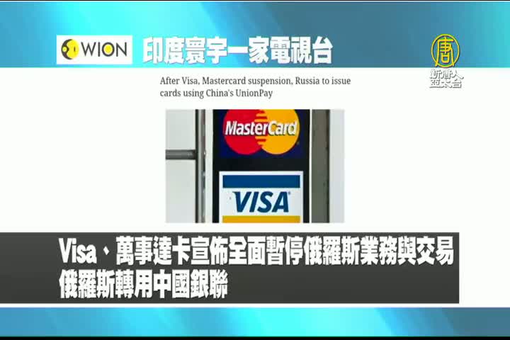 【新唐人亞太台 2022 年 03 月 07 日訊】最後是印度寰宇一家電視台報導:Visa、萬事達卡宣佈全面暫停俄羅斯業務與交易,俄羅斯銀行轉用中國銀聯。
