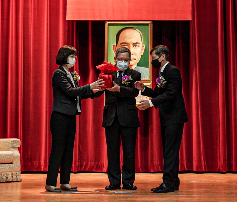關務署長謝鈴媛(左)調任財政部參事,副署長彭英偉(右)升任署長,財政部長蘇建榮(中)7日主持交接典禮。(圖/中央社)