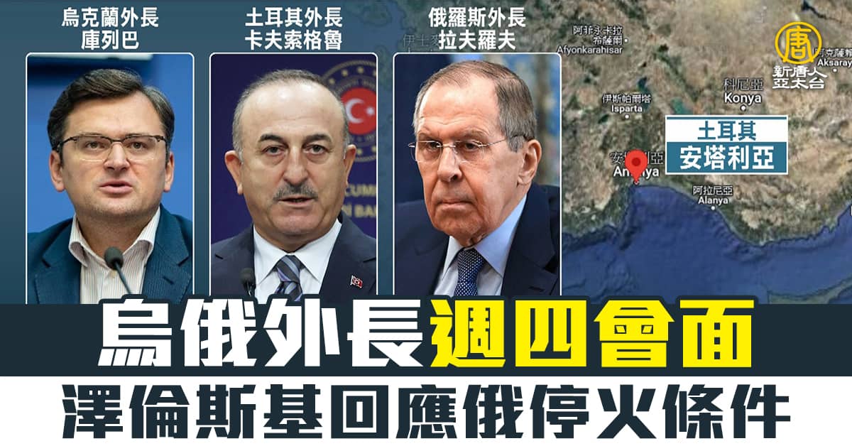 【新唐人亞太台 2022 年 03 月 08 日訊】3月10號,烏克蘭外長庫列巴和俄羅斯外長拉夫羅夫,將在土耳其的安塔利亞舉行會談。這是烏俄戰爭爆發以來,兩人首次面對面會談。昨天,俄羅斯也首次明確提出4項停火條件。對此,烏克蘭總統澤倫斯基表示,烏克蘭有可能的解決方案,但還是需要與俄羅斯總統普丁展開對話。