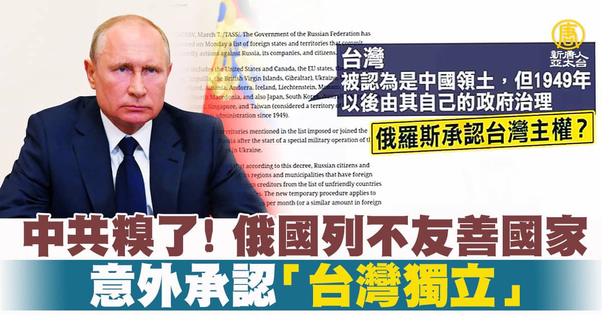 【新唐人亞太台 2022 年 03 月 08 日訊】歡迎回來。俄羅斯出兵烏克蘭,各國陸續祭出經濟制裁,現在俄國總統普丁也提出反制。俄羅斯政府簽署一份「不友善國家」名單,當中除了歐美各國,台灣也上榜。而且在俄媒報導提到台灣時,雖然也被列為中國領土,但還特別標註,在1949年後就由自己的政府管理,引發外界關注,俄羅斯是否承認台灣是主權獨立國家。