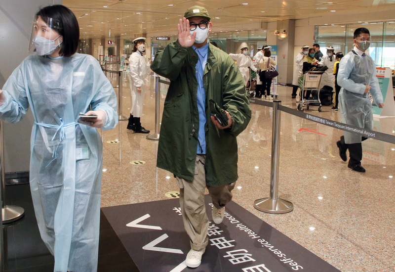 韓團酷龍成員具俊曄(中)9日上午抵達桃園國際機場,向現場採訪記者揮手致意,由服務人員引導進行健康宣告,再到發燒篩檢站旁的房間進行深喉唾液採檢。(圖/中央社)