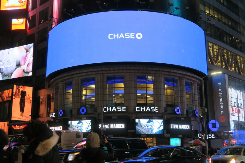 美國摩根大通集團10日宣布撤出俄羅斯,成為俄羅斯入侵烏克蘭後第2家決定放棄俄國生意的華爾街大型銀行。圖為紐約時報廣場的摩根大通廣告牆。(圖/中央社)
