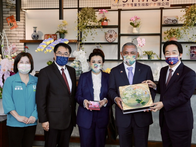 賴副總統、布里仙紐今天在台南市長黃偉哲、外交部常務次長俞大㵢及總統府發言人Kolas Yotaka(谷辣斯.尤達卡)陪同下,參訪世茂農業生技公司,由黃偉哲介紹台灣蘭花生技園區各種蘭花品種,布里仙紐也詳細詢問蘭花培植的過程與相關技術。