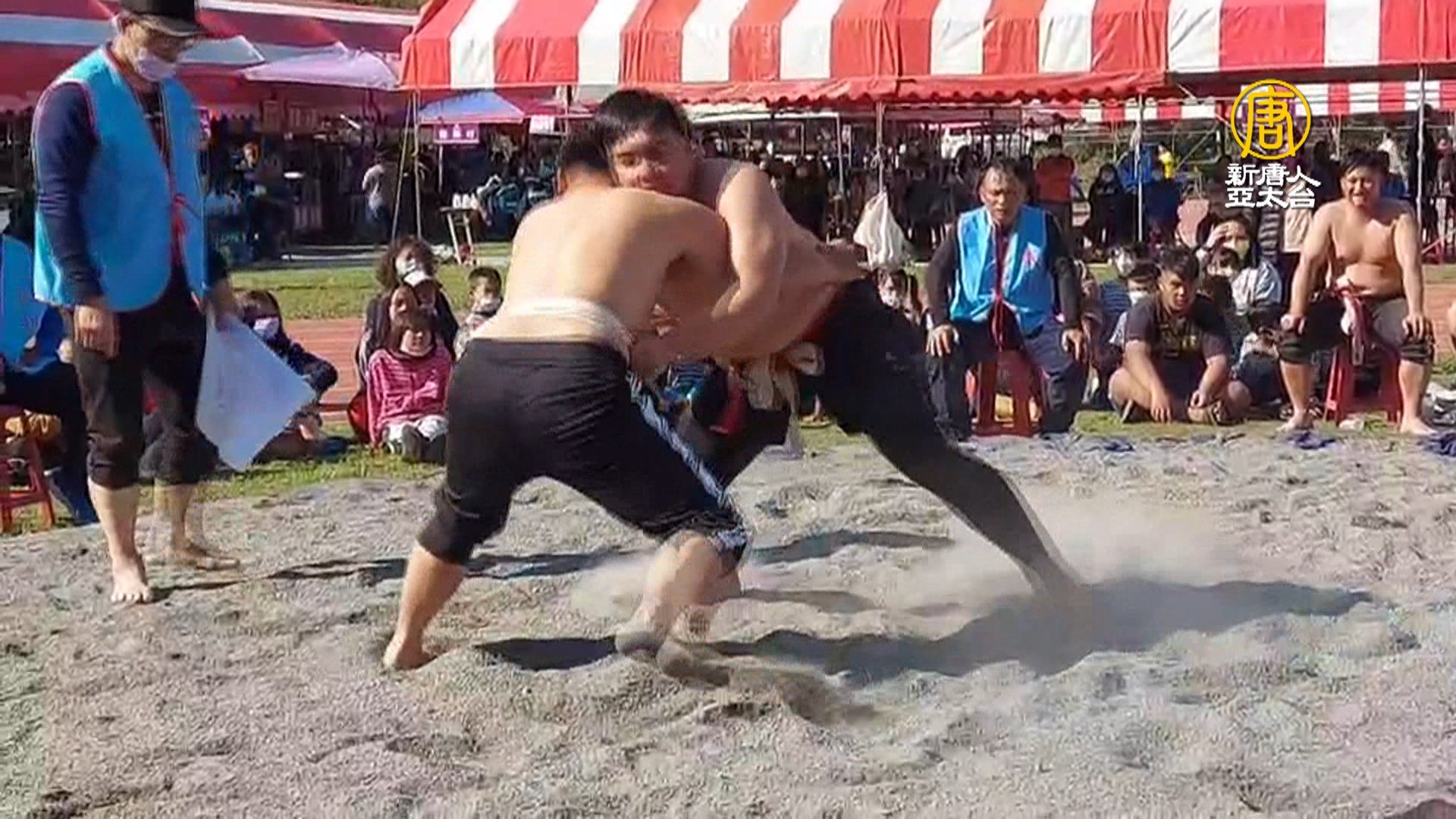 這兩位選手,在摔角場上以技巧求勝。雙方的雙手需要全程抓住對手的腰帶,背部或臀部先著地者就落敗,今年鄉運還把年齡層往下開放,讓小勇士也能同台拼搏。