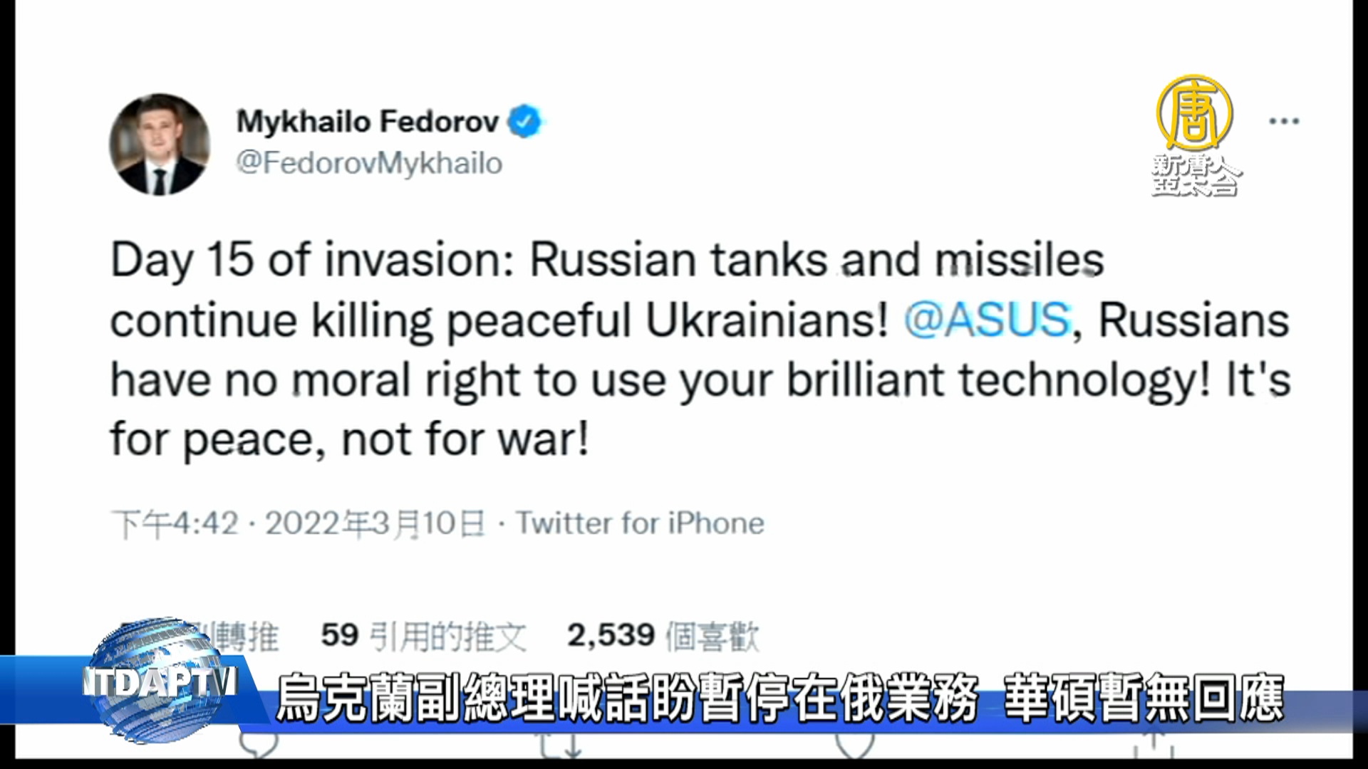 【新唐人亞太台 2022 年 03 月 12 日訊】俄烏戰爭持續進行中。烏克蘭副總理兼數位轉型部長費多羅夫,10日在社群媒體推特公開呼籲,希望華碩抵制俄羅斯,並公布寄給董座施崇棠的公開信。內容寫道「俄羅斯沒有道德權利使用你(華碩)的精湛技術,科技是為了和平,不是為了戰爭!」對此,華碩12日晚間對記者表示,目前暫無回應。另外,烏克蘭總統澤連斯基,上周與美國300名議員視訊會議時,用的就是華碩筆電。