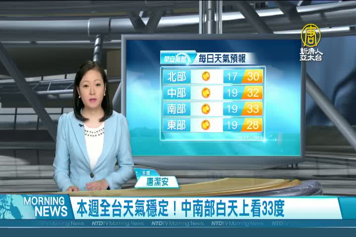 【新唐人亞太台 2022 年 03 月 14 日訊】歡迎您收看3月14日的早安新唐人,我是唐潔安,先來帶您關心天氣。又是一個星期的開始了,今天全台各地多是多雲到晴,氣象局說,未來一週內沒有明顯系統影響台灣,整體的天氣穩定,中南部高溫上看攝氏33度,不過,日夜溫差可能達到10度,提醒您留意。帶您一起來看到國際媒體重要訊息。