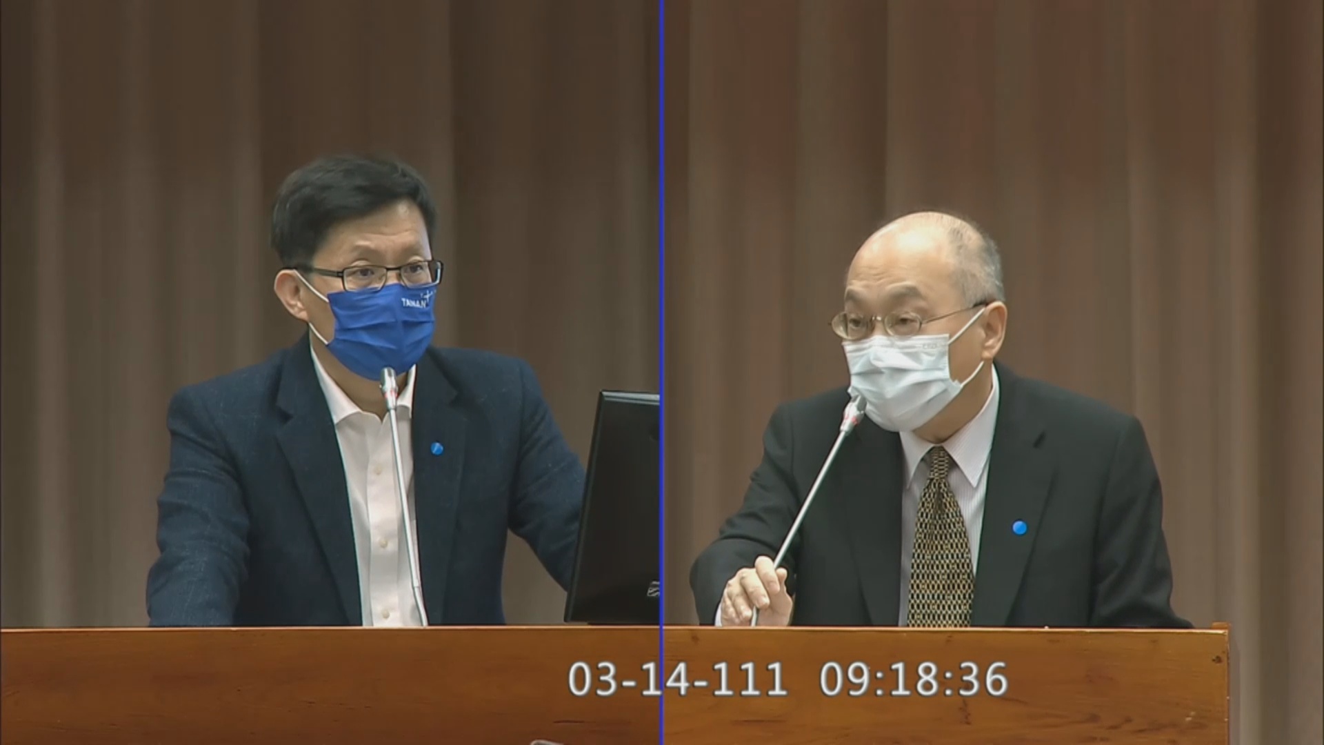 故宮南院6日因館內供電迴路跳脫,造成部分區域停電、下午閉館。故宮院長吳密察(右)今天表示,對閉館一事深感抱歉,文物儲放區域未受停電影響,未來將精進縮短維修時間。圖左為立委張廖萬堅。(圖/翻攝自立法院網站)