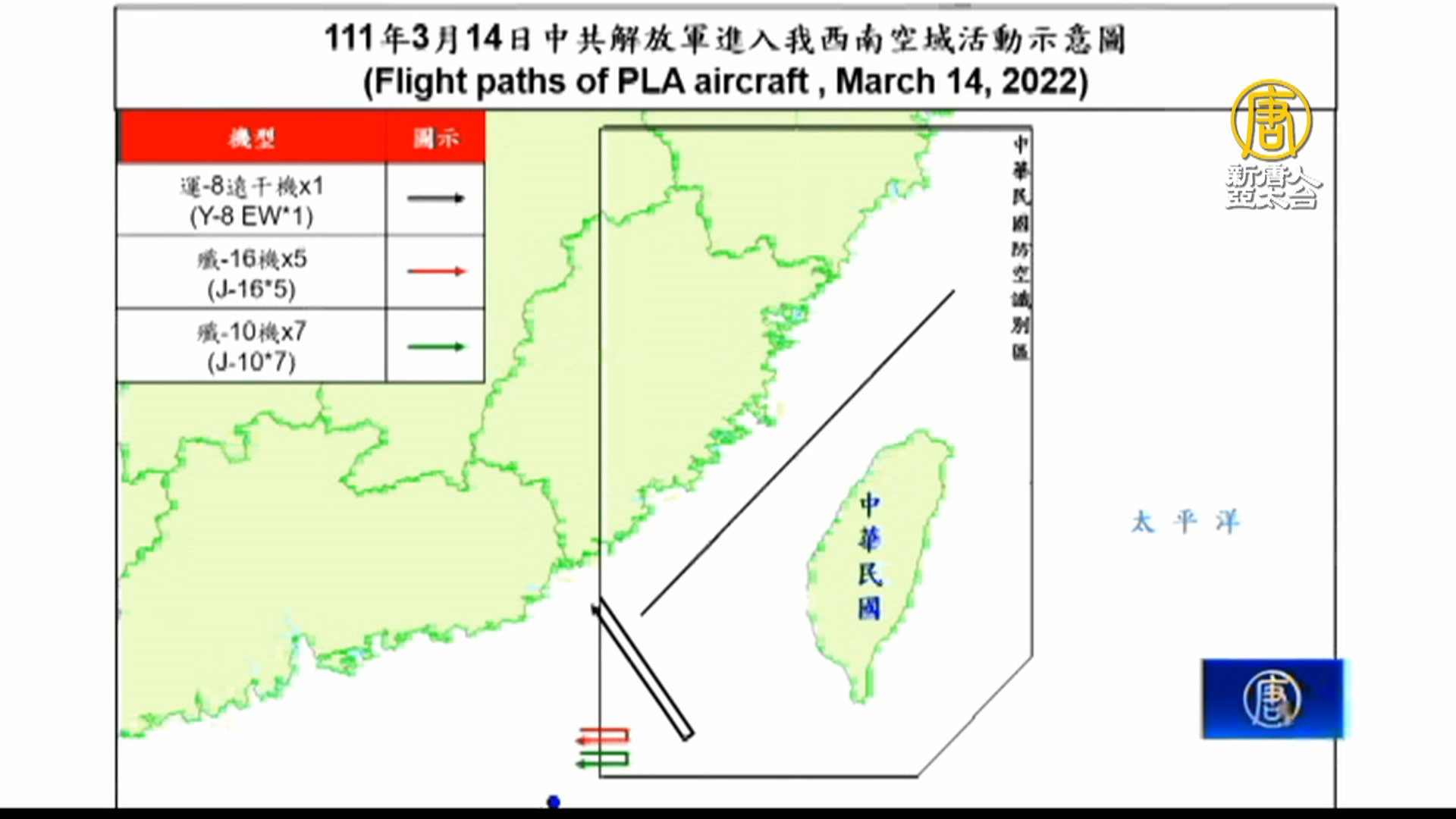 【新唐人亞太台 2022 年 03 月 14 日訊】好,今天(14日)在台灣幻象2000墜海之際,共機再次襲擾台灣空域,國防部公布,14日白天有13架共機侵擾台灣西南防空識別區(ADIZ)而台灣罕見是由民航局高雄進場台,代替空軍對共機廣播驅離。