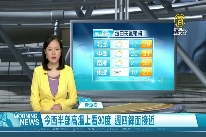 【新唐人亞太台 2022 年 03 月 15 日訊】歡迎您收看3月15日的早安新唐人,我是唐潔安,先來帶您關心天氣。今天西半部高溫可達30度左右,周四(17日)晚間起鋒面接近,周五(18日)東北季風增強,北部、東半部地區,會再轉濕涼,週末兩天(19日、20日)東北季風減弱,北部及東北部氣溫會再回升。帶您一起來看到國際媒體重要訊息。