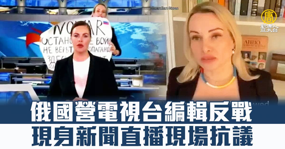 【新唐人亞太台 2022 年 03 月 15 日訊】俄羅斯民眾即使面臨被拘捕風險,仍在多個城市發起反戰抗議活動。14日,俄羅斯國營電視台第一頻道(Channel One)在直播晚間新聞的黃金時段中,一位名叫奧斯雅尼可娃的編輯,現身攝影棚進行抗議,手持標語站在主播後方高呼,「不要戰爭,停止戰爭」,後來畫面被切走,但影片被網友紀錄下來,並被廣傳。烏克蘭總統澤倫斯基在演講時向這名女子表達謝意致敬。奧斯雅尼可娃後來被捕,不過她在舉牌行動前,有錄下自白,呼籲俄羅斯人阻止自相殘殺的戰爭。