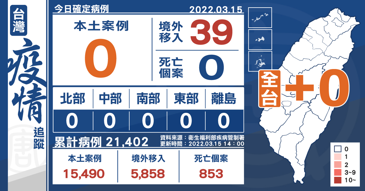 【新唐人亞太台 2022 年 03 月 15 日訊】中央流行疫情指揮中心今(15)日發言人莊人祥公布,國內新增39例COVID-19境外移入確定病例,其中10例為航班落地採檢陽性;另確診個案中無新增死亡。