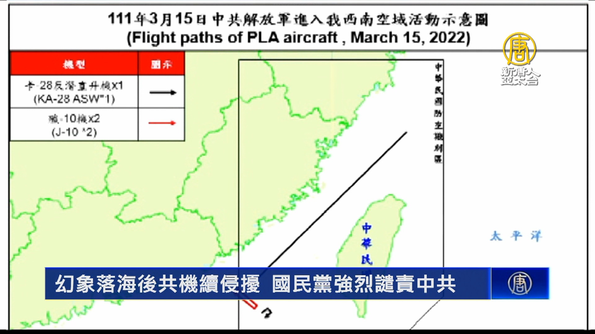 【新唐人亞太台 2022 年 03 月 15 日訊】好,台灣幻象戰機落海當天,中共派13架軍機侵擾台灣,隔天(15日)又派3架次侵擾台灣西南空域,包括卡-28反潛直升機、兩架次殲-10戰機,中華民國空軍派空中巡邏兵力應對、廣播驅離、以防空飛彈追監。國民黨文傳會主委凌濤表示,國民黨「強烈譴責」共機頻繁擾台,無論中共以何種動機理由,都已經造成台灣民眾的不安與反感。信傳媒引述黨務人士透露,國民黨文傳體系研擬一套定式「抗議稿」,今後共機擾台,只要媒體有回應需要,國民黨就即時提出抗議。