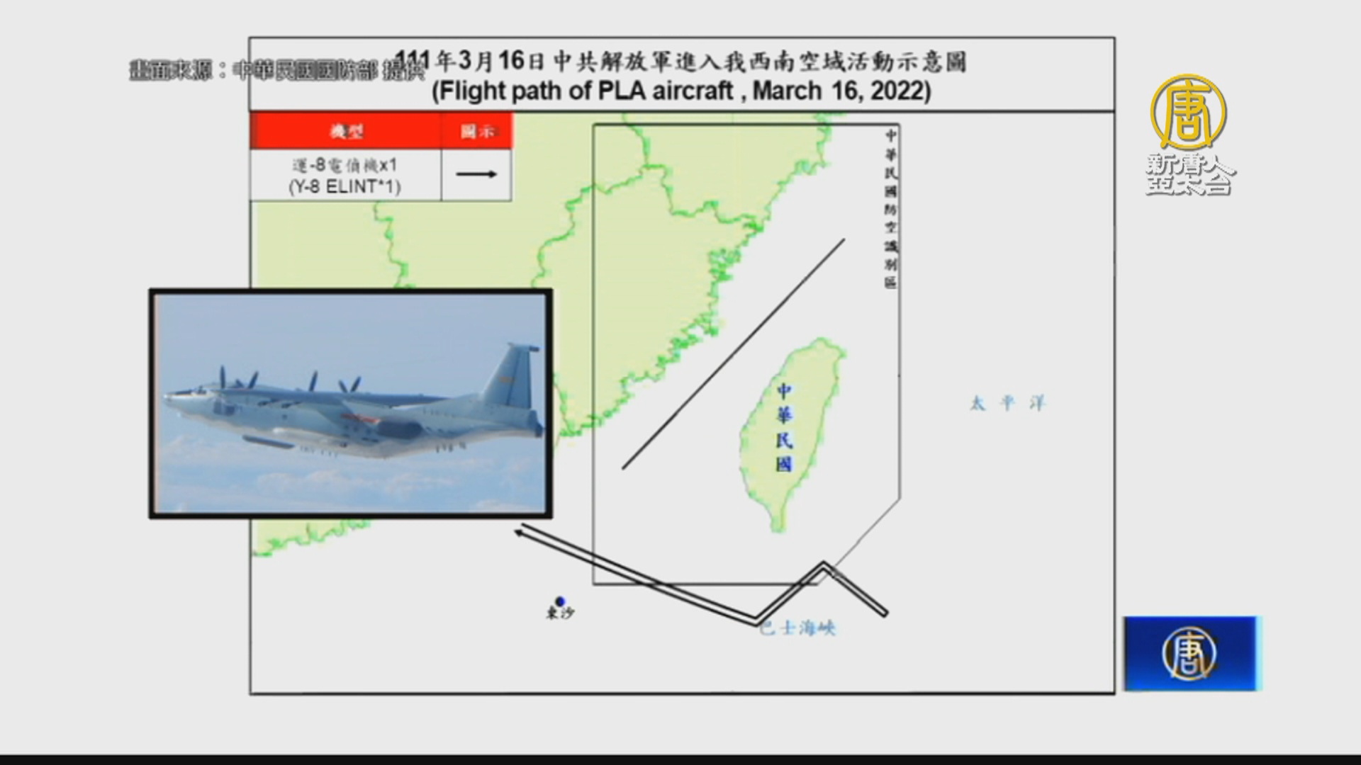 【新唐人亞太台 2022 年 03 月 16 日訊】再來看到,又有共機擾台,國防部(16日)晚間發布「即時軍事動態」,共機1架「運-8」電偵機從台海中線以南空域,進入我西南防空識別區之後,一路飛進巴士海峽、西太平洋,等於繞行整個台灣南部空域。空軍派遣空中巡邏兵力應對、廣播驅離、防空飛彈追監。另外,陸軍東引指揮部,今天舉行「忠義操演」實彈射擊演訓,驗證防區各部隊的作戰能力,而各據點火砲及輕、重兵器依時序向目標區精準射擊,圓滿完成任務。這次演訓透過訓練幹部指揮程序,並藉實彈射擊檢驗兵、火力配置的適切性,使官兵熟練建制武器實彈射擊要領,以強化防區整體戰力,維護地區整體安全。