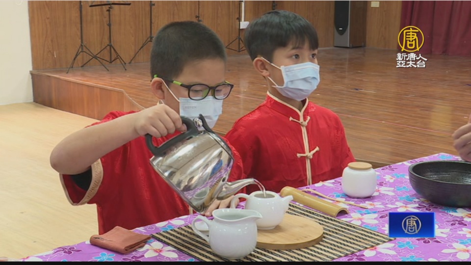 小朋友神情專注的提起水壺,沖入開水,恭敬的為來賓奉茶。位於峨眉鄉的富興國小,已經超過百年歷史,培育了很多傑出校友,包括邱鏡淳和楊文科二位新竹縣長。楊文科縣長的胞弟楊文瑞也是這裡出身,為了感念母校,他攜手國際崇她新竹社,以及台北台風扶輪社,共同認捐新唐人原創動畫《天庭小子-小乾坤》和《悠遊字在》,作為學校的輔助教材。