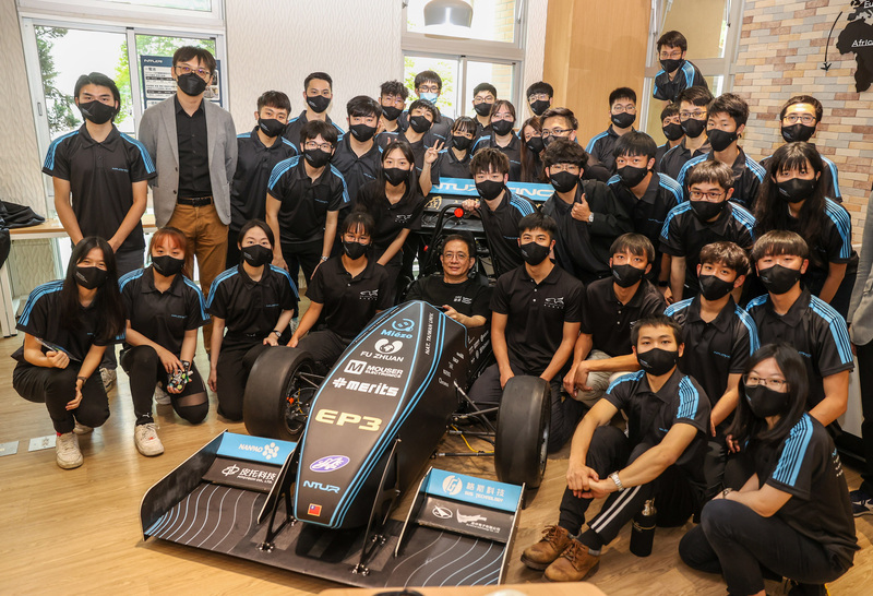 台灣大學賽車隊新款賽車Epsilon3發表會19日下午在台大校內舉行,校長管中閔(前左5)出席為新車揭幕並親自試乘,與團隊成員開心合影。(圖/中央社)