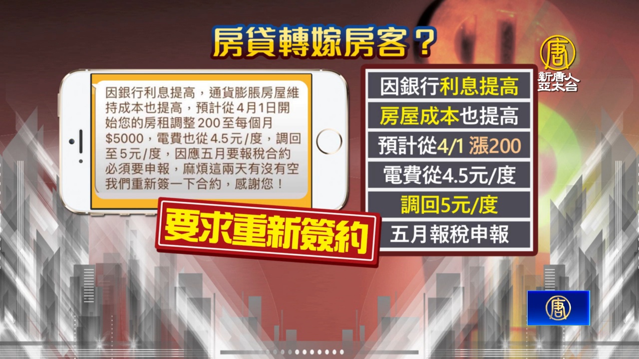【新唐人亞太台 2022 年 03 月 19 日訊】央行跟進美國腳步決定升息1碼,不只讓許多房貸族壓力變大,也讓不少租屋族憂心,房東會將利息轉嫁在自己身上!就有房客爆料,央行才剛宣布升息,房東就通知1個月租金要漲200元,電費也調到1度5元,但律師說,房租不能說漲就漲。