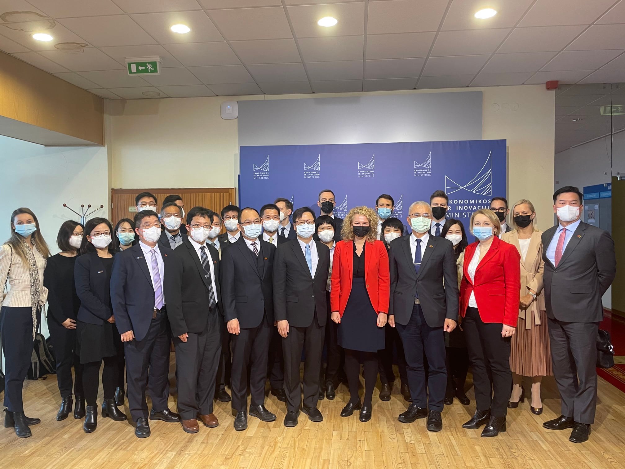 立陶宛經濟暨創新部長阿爾莫奈特(前排右4)21日接見台灣「中東歐經貿考察團」。(圖/翻攝自FB@Ekonomikos ir inovacijų ministerija)
