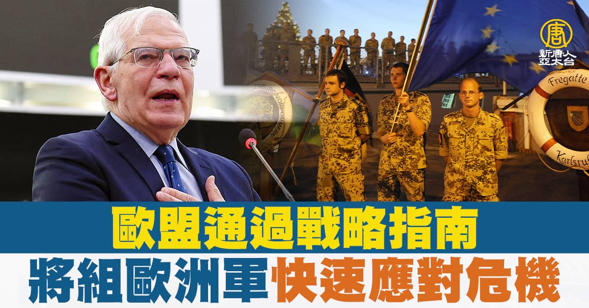 【新唐人亞太台 2022 年 03 月 22 日訊】歐洲聯盟部長理事會今天通過「戰略指南」,將組建5000名「歐洲軍」聯合部隊快速應對危機。歐盟外長表示,當俄羅斯發動侵略使戰爭重新回到歐洲時,這是歐盟防務行動的歷史轉折點。