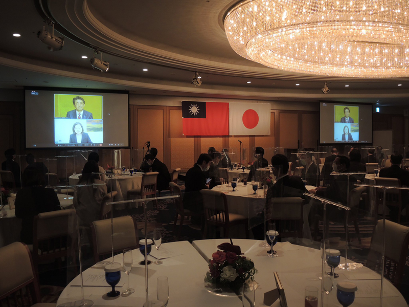 日華懇22日傍晚在東京舉行年度大會,蔡總統(左下)應邀與安倍晉三(左上)視訊對談,與會的駐日代表謝長廷稱「這是歷史性的視訊會談」,意義重大。(圖/日華懇提供)