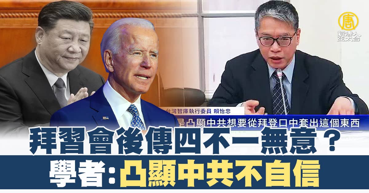台灣智庫執行委員 賴怡忠:「中共它自己提說,拜登對於主動對中共提到有所謂的四不一無意,這當然不僅在美國沒宣讀,背景說明也完全沒有。」「 這個過程本身是沒有自信,所以才怎麼樣,要主動幫對方發布,所以它所凸顯的,其實不是說所謂的拜登有沒有講四不一無意,而是凸顯中共想要從拜登口中套出這個東西,但是又怕拜登沒說,就主動幫他發表。」