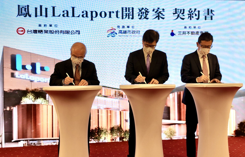 高雄市政府上午舉行三井集團與台糖公司「LaLaport購物中心」簽約儀式,在市長陳其邁見證下,由台灣三井不動產董事長下町一朗和台糖董事長陳昭義完成簽約。