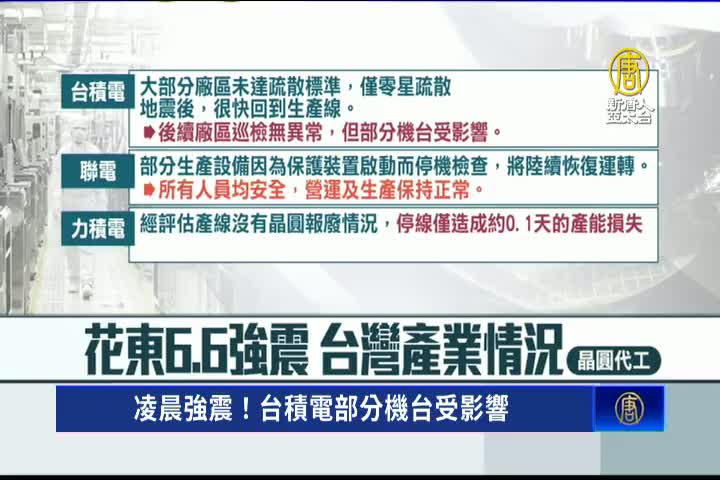 【新唐人亞太台 2022 年 03 月 23 日訊】花蓮近海今天(23日)凌晨發生多次地震,最大達芮氏規模6.6。全台都感受到明顯的搖晃。晶圓代工廠台積電表示部分機台受到影響;力積電因為停線造成約2到3小時的產能損失。