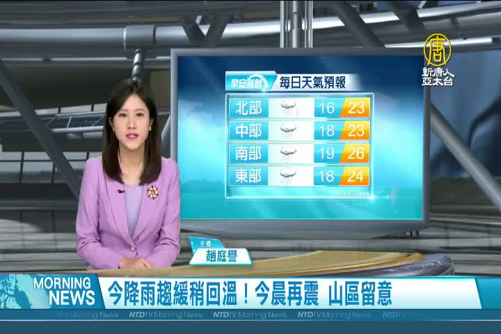 【新唐人亞太台 2022 年 03 月 24 日訊】歡迎您收看3月24日的早安新唐人,我是趙庭譽,先來帶您關心天氣。今天西半部降雨機率高,但降雨空檔增加,雨勢也較為緩和。全台白天氣溫大約落在22、23度,另外,今天清晨4點45分,再發生規模4.8地震 ,花東最大震度3級。提醒觀眾朋友,地震後土質較為鬆軟,加上持續性降雨,留意山區坍方、落石及土石流發生。帶您一起來看到國際媒體重要訊息。