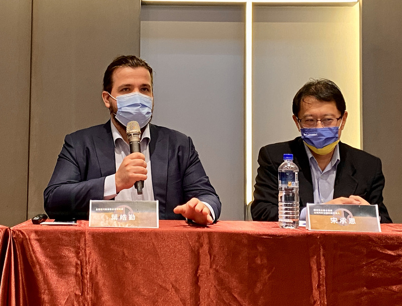 台灣世代教育基金會研究員葉皓勤(圖左)(Marcin Jerzewski)25日在「烏克蘭啟示錄與台灣全民國防」 論壇上,以烏克蘭的國土防衛軍(TDF)討論全民國防。(圖/中央社)
