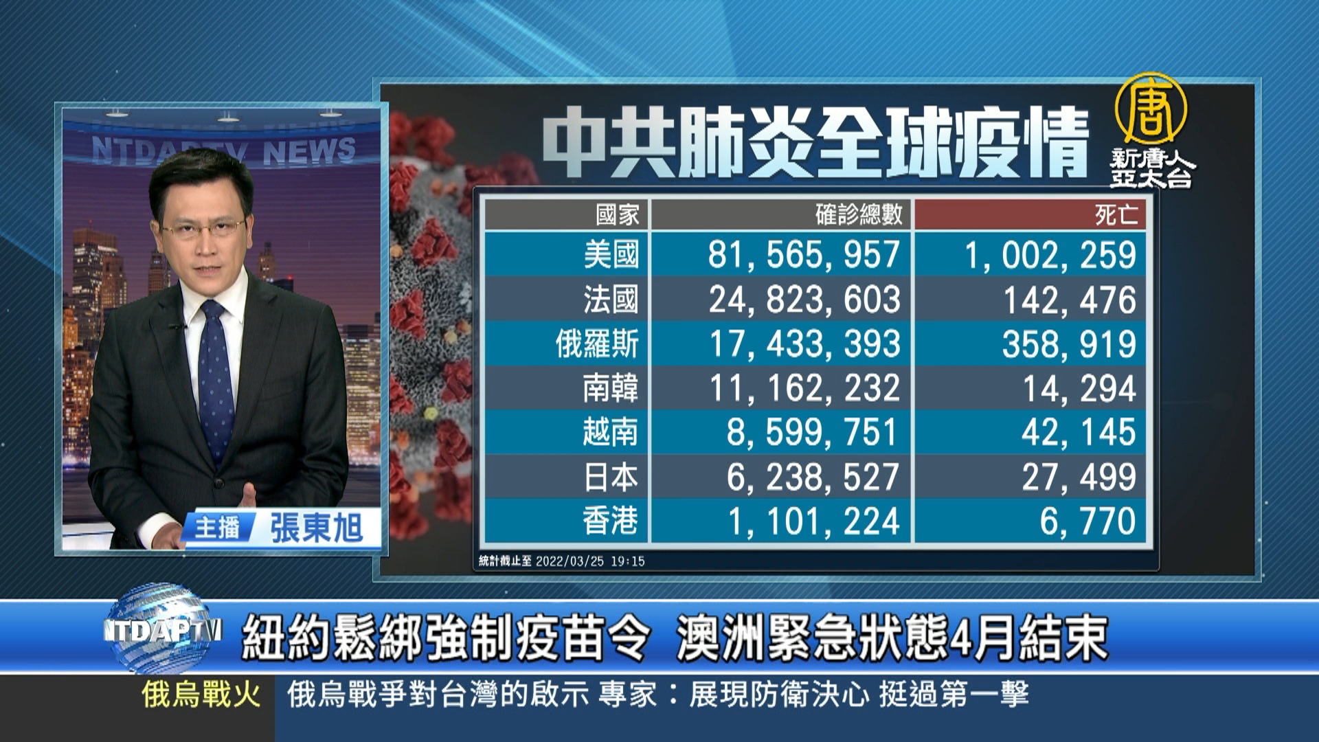 【新唐人亞太台 2022 年 03 月 25 日訊】來關心中共肺炎疫情最新情況,全球確診超過4億7千7百38萬例,死亡將近6百10萬9千多人。但中共、伊朗、北韓等政權,被認為嚴重低報數據。亞洲方面,南韓新增33萬9千多例確診,連續兩天低於40萬例。香港新增1萬多例確診,死亡增加1百92人。日本疫情仍處高檔,當局研議最快5月開打第4劑疫苗。新加坡將為高風險族群接種第2劑追加劑。美國紐約市鬆綁私部門疫苗接種令,讓美國職籃NBA布魯克林籃網隊後衛厄文等職業球員,及藝人豁免強制接種疫苗。澳洲宣布,「人類生物安全緊急狀態」將在4月17日失效,而且不再更新。