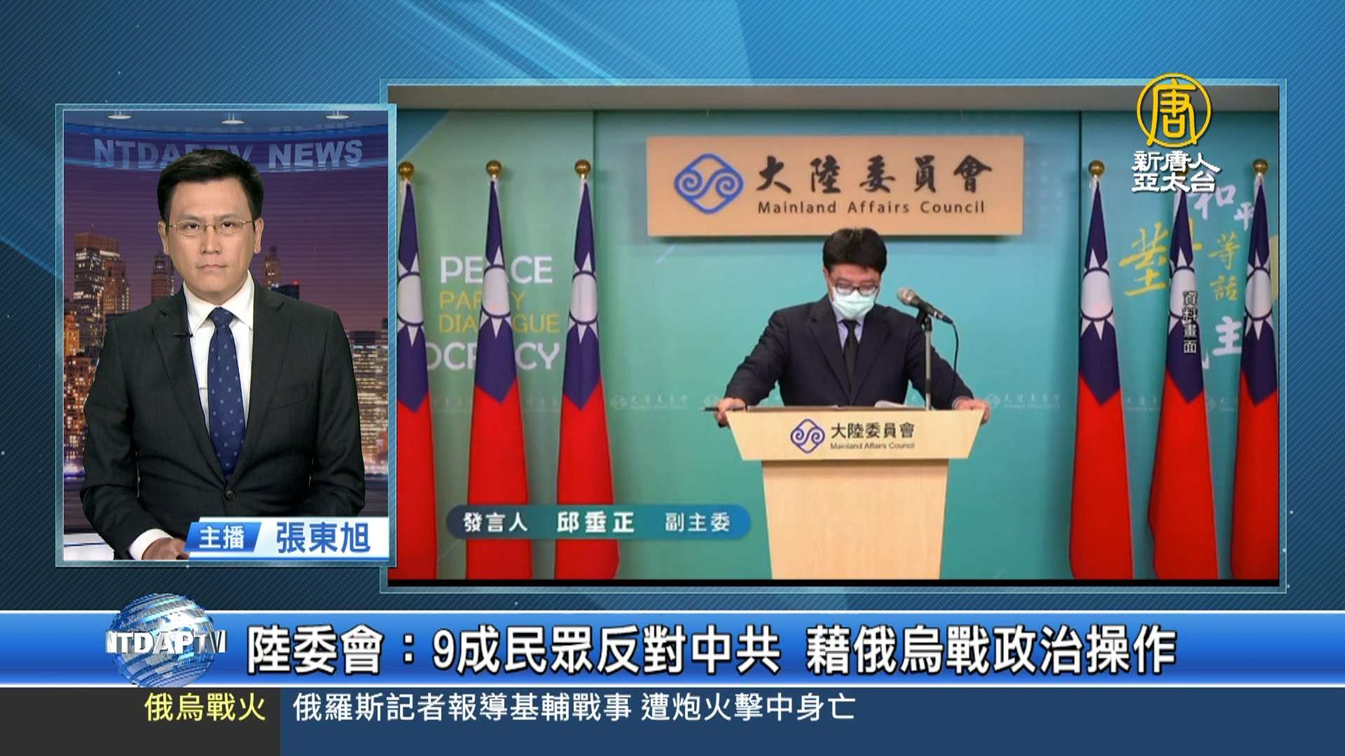 【新唐人亞太台 2022 年 03 月 25 日訊】歡迎回來。俄烏戰爭爆發滿一個月,陸委會今天公布例行民調結果,有90.9%的民眾反對中共以「今日烏克蘭、明日台灣」等「惡意政治操作及散布假訊息」影響台灣士氣。陸委會強調,調查結果顯示中共藉區域情勢擴大操作對台認知作戰,引起台灣民眾反感,並支持政府捍衛中華民國主權安全的應對作為。民調顯示,有83.3%的民眾認同總統蔡英文強調因應變局及面對挑戰,民主團結是唯一方法及選項。