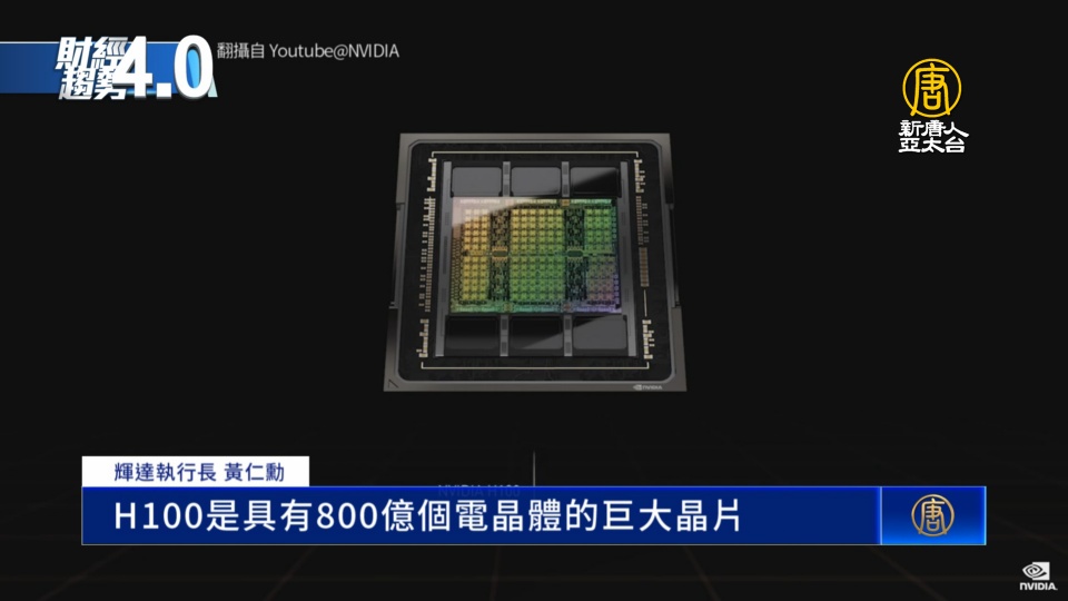 【新唐人亞太台 2022 年 03 月 26 日訊】繪圖處理器大廠輝達,22日在年度GPU 技術大會(GTC)上,宣布新一代資料中心架構繪圖處理器(GPU) H100,採用台積電4奈米製程。除了效能大幅提升,黃仁勳還表示,只要20個 H100 GPU,就能撐起全世界的網路流量。