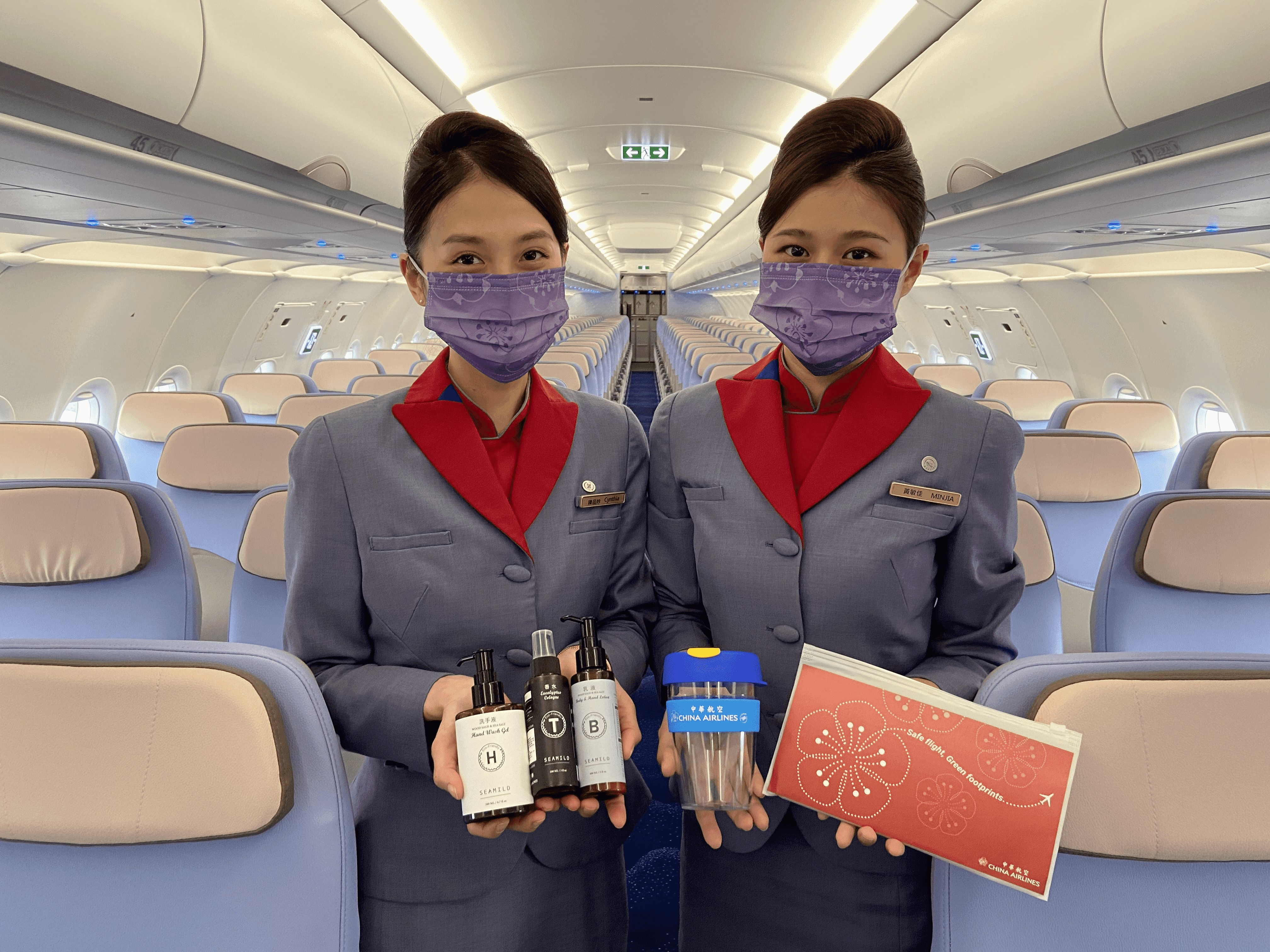 為歡慶A321neo新機首度上線營運,華航致贈旅客貼心伴手禮,包含清潔保養香氛禮盒三件組、環保杯及機上防護包。(圖/中華航空提供)