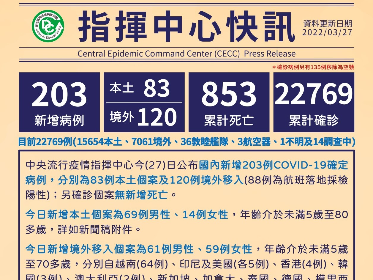 中央流行疫情指揮中心指揮官陳時中今天下午記者會公布,新增203例COVID-19(2019冠狀病毒疾病)確定病例,分別為83例本土個案及120例境外移入(88例為航班落地採檢陽性);另確診個案無新增死亡。