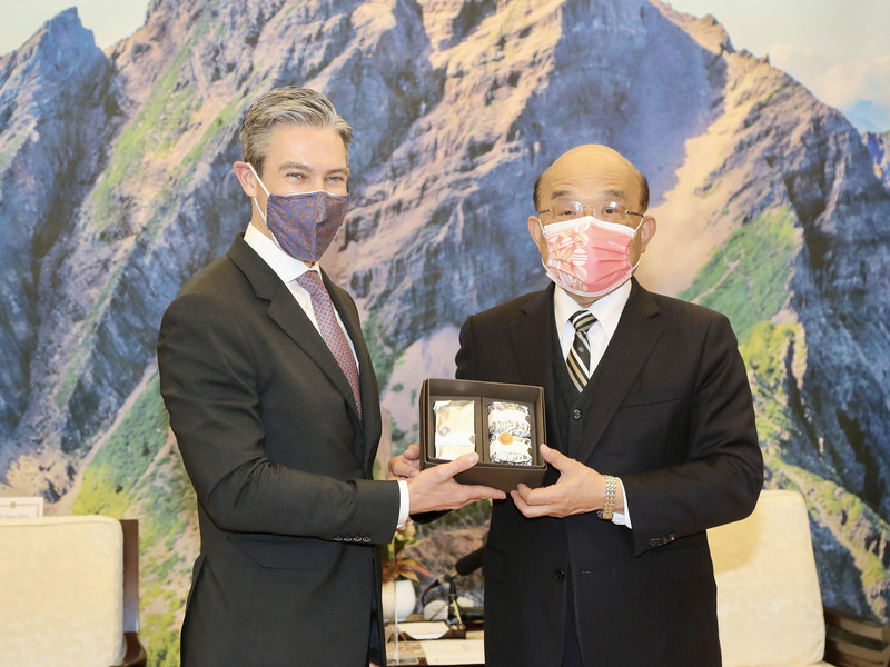 行政院長蘇貞昌(右)28日在行政院接見美國國家民主基金會長威爾森(Damon Wilson)(左),並致贈禮品給威爾森。(圖/中央社)