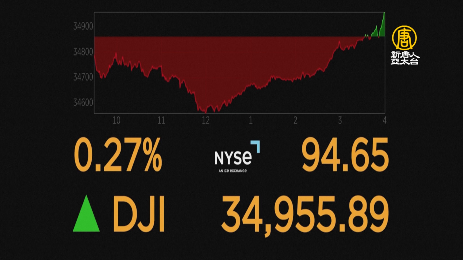 美股道瓊指數上漲 94.65 點,或 0.27%,收 34,955.89 點。