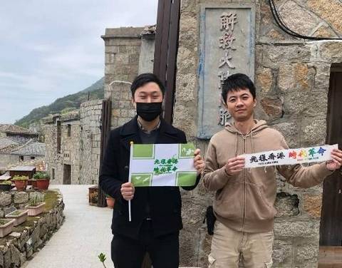 民進黨連江縣黨部主委李問(圖左)青年節這日與民進黨黨部北竿鄉服務主任詹庭語(圖右)一齊參與「絹印活動」,聲援香港。(圖擷取自「李問」臉書)