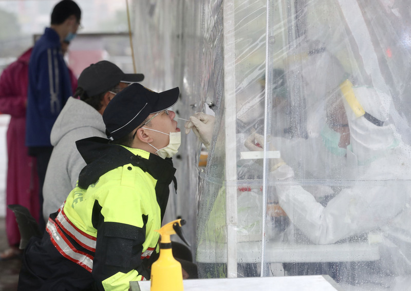 基隆市警局2名員警在疫調時隱瞞足跡,導致多名同仁染疫,警方表示將從重究責。圖為基隆所有員警27日接受全面採檢。(圖/中央社)