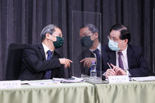 國發會30日舉行記者會說明台灣2050淨零排放路徑及策略,國發會主委龔明鑫(左)、經濟部次長林全能 (右)出席,兩人於席間交談。(圖/中央社)