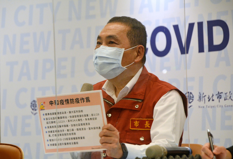 新北市長侯友宜(圖)1日在疫情記者會中表示,中和公寓爆發群聚疫情,已開設機動篩檢站找尋潛藏個案,自 3月29日起共篩檢2112人,24人陽性,多為無症狀患者。(圖/中央社)
