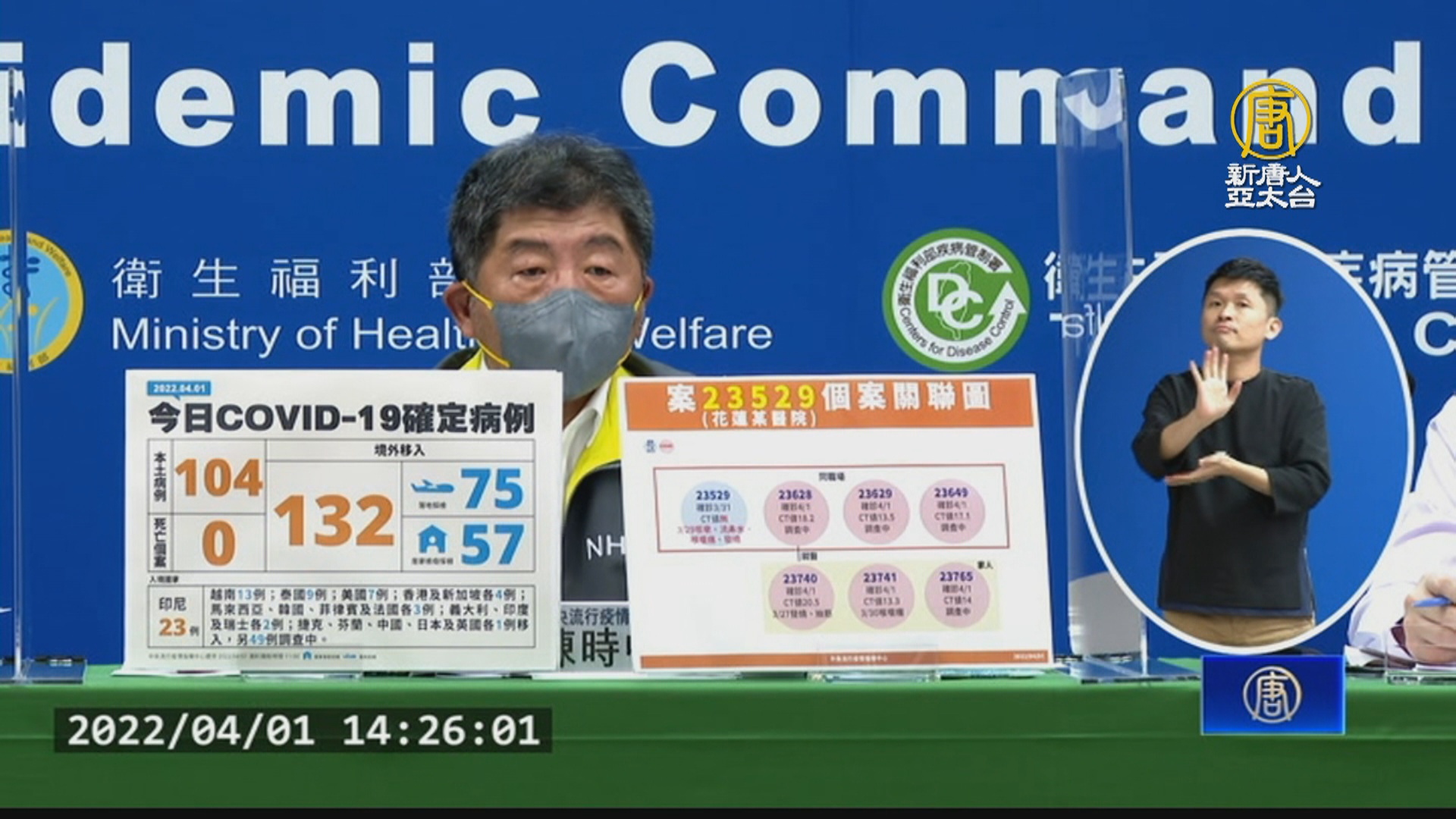 【新唐人亞太台 2022 年 04 月 01 日訊】再來看到,台灣今天新增104例本土個案,再度創下今年新高。境外個案也有132例。而明天(1日)就是清明連假,防疫指揮官陳時中就提醒民眾,一定要勤洗手戴口罩,保持社交距離。至於這波疫情會不會影響邊境檢疫放寬為7天,則還要評估。未來大方向,會堅持經濟防疫的模式,開放的腳步仍然向前。