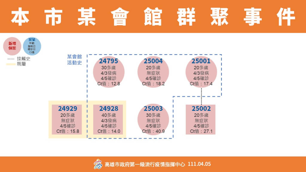 其他新增的7例均與高雄市某會館群聚有關,案24795為薩克斯風演奏者。潘炤穎說,案24795確診後,經疫調匡列,第一圈會館工作人員及顧客中,包含案24795共5人陽性,第二圈為第一圈同住者等密切接觸者,也有2人陽性。