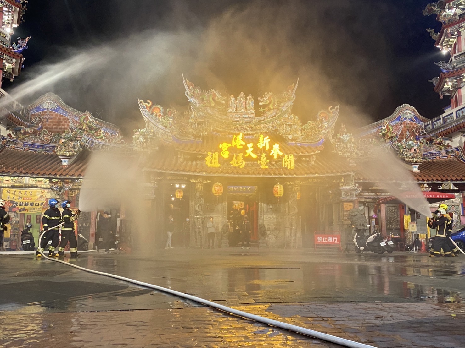 呂清海表示,除了在活動前預先勤務部署,5日晚上也在奉天宮舉辦火災搶救訓練,並邀集奉天宮董事林永宏、新港分隊、新港義消分隊等34人參與本次演練。演練狀況為奉天宮內,因燃放爆竹引發火災,濃煙火舌急速竄出,廟方初期滅火無效,火勢擴大延燒,警、義消人員編組完成滅火任務。